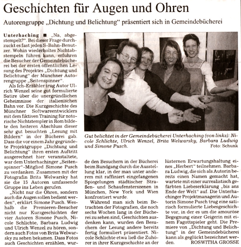 dass sie schreibt und in einer Autorengruppe, bei den Seitenspinnern, ist. Ich habe daraufhin erzählt,